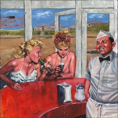 “I call my work “Pop Nostalgia”. My subjects focus on pop culture, most of my subjects derive from my love of comic books, cinema and music, primarily from the 1920s through the 1970s. Humor (with a heavy dose of satire) is a major subject in my work. Although the vast majority of my work is oil on canvas, I occasionally veer of into acrylics, watercolors and pen & ink.